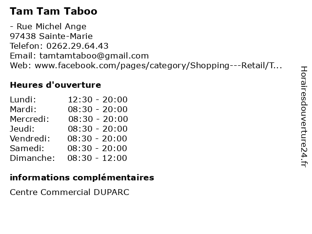 1 Tam-Tam Taboo (Distance: 22,59 km) - Centre commercial Sacré Coeur, 97420 Le Port boutique, déco, mugs, objets, taboo, tam, tasses 2 Boutique Adopt' (Distance: 0,00 km) 43 rue Michel Ange, 97438 Sainte-Marie accessoires, adopt, adopt', boutique, maquillage, parfumerie 3 Lingerie Boutique (Distance: 0,00 km) 30-32 Rue Michel Ange, 97438 Sainte-Marie boutique, dessous, lingerie, nuisette 4 San Marina (Distance: 0,00 km) - Rue Michel Ange, 97438 Sainte-Marie boutique, chaussures, femme, homme, marina, san, sanmarina 5 SPORT 2000 (Distance: 0,00 km) - Rue Michel Ange, 97438 Sainte-Marie 2000, boutique, chaussure, habillement, sport 6 Miniso (Distance: 0,08 km) 43 Rue Michel Ange, 97438 Sainte-Marie accessoires, boutique, cosmetique, miniso, peluches |