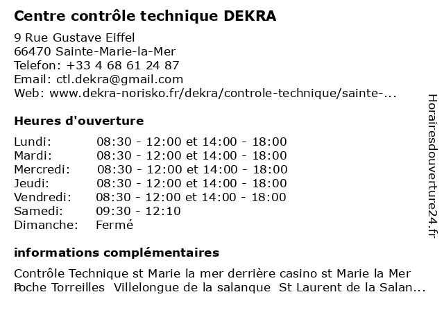 Description de l'entreprise :Préparer votre contrôle techniquePour préparer votre contrôle technique dans notre centre DEKRA de Sainte-Marie-la-Mer, vous pouvez vérifier en amont différents points comme les pneumatiques, la visibilité, le niveau d'huile ou encore l'habitacle. Pour tout savoir, consultez notre vidéo. Voir l'offre |