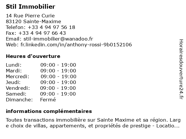 1 Immo Stil (Distance: 56,61 km) 62 boulevard Maréchal Juin, 06800 Cagnes-sur-Mer agence, gestion, immo, immobilier, location, stil, transaction, vente 2 7 Agence - Thieffry Immobilier (Distance: 0,02 km) 7 rue Pierre et Marie Curie, 83120 Sainte-Maxime agence, appartement, immobilier, location, maison, thieffry, vente 3 Ab Inter Agence (Distance: 0,04 km) 34 rue de Verdun, 83120 Sainte Maxime ab, agence, gestion, immobilier, inter, location, transactions, vente 4 Label Agence (Distance: 0,04 km) 3 rue Pierre et Marie Curie, 83120 Sainte-Maxime agence, appartement, immobilier, label, location, maison, vente 5 Nexity (Distance: 0,05 km) 8 Rue Felix Martin, 83120 Maxime agences, immobilier, immobilières, location, nexity 6 Sud' Vacances (Distance: 0,06 km) 44 Rue de Verdun, 83120 Sainte-Maxime agence, gestion, immobilier, location, saisonnier, sud', transactions, vacances |