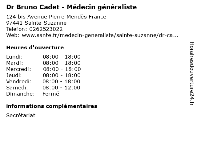 1 Dr Bruno Bouchet - Anesthésiste (Distance: 16,77 km) - Allée des Topazes, 97400 Saint-Denis anesthésiste, bouchet, bruno, consultation, docteur, dr, med, médecin, traitement 2 Dr Bruno Morot - Anesthésiste (Distance: 16,77 km) - Allée des Topazes, 97400 Saint-Denis anesthésiste, bruno, consultation, docteur, dr, med, morot, médecin, traitement 3 École primaire publique Pierre Cadet (Distance: 45,35 km) 211 Route des Canots, 97427 L'Étang-Salé cadet, cours, education, pierre, primaire, publique, services, École, école 4 Ecole Primaire Publique Thérésien Cadet (Distance: 45,86 km) 81 Chemin la Brune, 97425 Les Avirons cadet, cours, ecole, education, primaire, publique, services, thérésien, école 5 Dr Bruno Nurbel - Chirurgien orthopédique (Distance: 50,31 km) - Avenue François Mitterrand, 97448 Saint-Pierre bruno, chirurgien, chu, cilaos, de, dr, joseph, la, le, louis, nurbel, orthopedie, orthopédique, pierre, réunion, saint, sites, st, sud, tampon 6 Dr Bruno Delelis - Chirurgien vasculaire (Distance: 50,31 km) - Avenue François Mitterrand, 97448 Saint-Pierre arthere, bruno, chirurgien, chu, cilaos, corronere, de, delelis, dr, joseph, la, le, louis, pierre, réunion, saint, sites, st, sud, vasculaire |