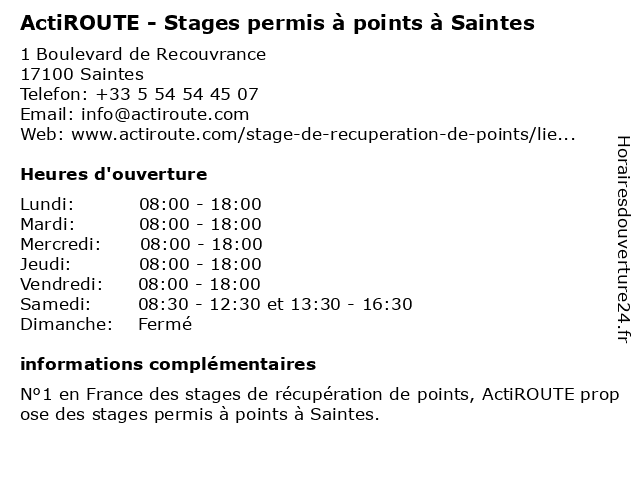 | Samedi | 08:30-12:30 et 13:30-16:30 |
