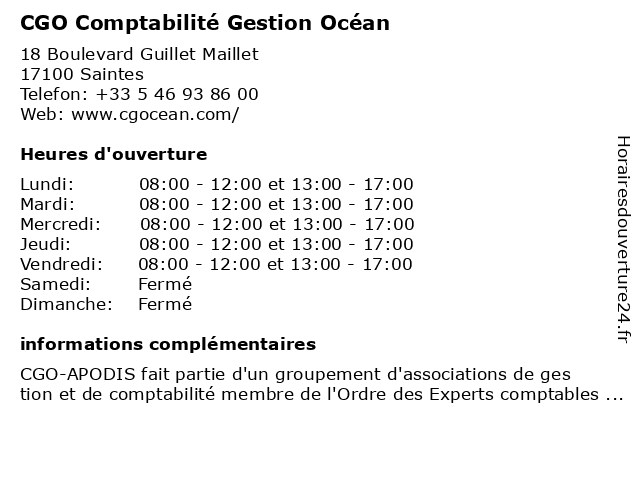 1 CGO Comptabilité Gestion Océan (Distance: 4,15 km) 70 Route de Saint-Jean d'Angély, 17100 Fontcouverte cgo, comptabilité, gestion, océan 3 5 ESPACE GESTION CONSEIL ET FORMATION (Distance: 1,83 km) 30 Cours Paul Doumer, 17100 Saintes conseil, espace, et, formation, gestion 6 |