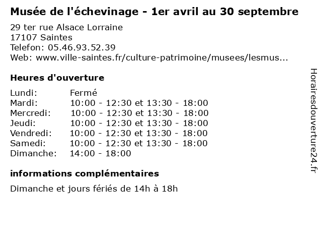 1 Musée de l' Échevinage - 1er avril au 30 septembre (Distance: 0,00 km) 29 Rue Alsace-Lorraine, 17100 Saintes 1er, 30, au, avril, culture, de, du, l', l'échevinage, museum, musée, peintre paysagiste, septembre, échevinage 2 Musée archéologique - 1er avril au 30 septembre (Distance: 0,19 km) - Esplanade André Malraux, 17107 Saintes 1er, 30, alimentation, archéologique, au, avril, jeux, loisirs, musée, musée archéologique, septembre, vaisselle 3 Musée Dupuy Mestreau - 2 avril au 30 septembre (Distance: 0,28 km) 4 rue Monconseil, 17107 Saintes 30, au, avril, bijoux, dupuy, faïences, gravures, mestreau, musée, musée dupuy mestreau, peintures, septembre 4 Amphithéâtre Gallo-Romain - 2 mai au 30 septembre (Distance: 0,91 km) 20 rue Lacurie, 17100 Saintes 30, amphithéâtre, amphithéâtre gallo-romain, au, gallo, l'amphithéâtre, mai, monument, romain, septembre, vestiges romains 5 Déchetterie (du 16 mars au 30 septembre) (Distance: 6,02 km) - Chemin des Prises, 17610 Chaniers 16, 30, au, du, déchets, déchetterie, mars, septembre 6 Déchetterie (Du 1er avril au 30 septembre) (Distance: 15,82 km) - La Combe à Boisson, 17260 Montpellier-de-Médillan 1er, 30, au, avril, du, déchets, déchetterie, septembre |