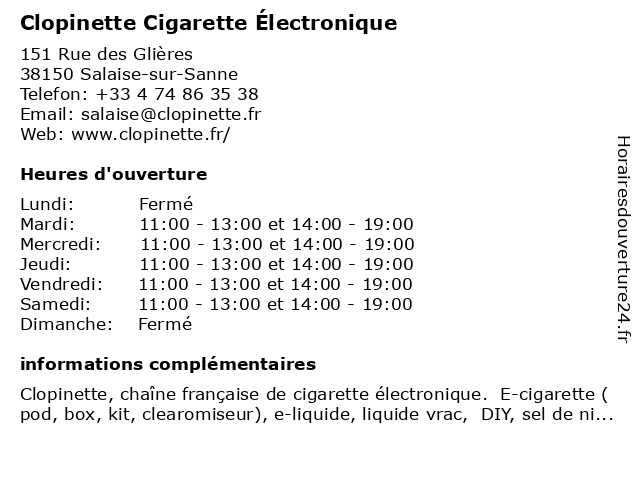 | 1 Clopinette (Distance: 0,00 km) 151 rue de Glière, 38150 Salaise sur Sanne accessoires, boutique, cigarettes, clopinette, tabac, vape, électronique 2 Vapostore (Distance: 34,15 km) 6 Place de l'Hôtel de Ville, 42000 Saint Étienne cigarette, cigarettes, e-liquide, electroniques, vapostore, vapotage, vapote, vapoteur, électronique 3 Vapostore (Distance: 44,30 km) 21 Quai Antoine Riboud, 69002 Lyon cigarette, cigarettes, e-liquide, electroniques, vapostore, vapotage, vapote, vapoteur, électronique 4 Au Bon Vapoteur (Distance: 45,34 km) 102 avenue Pierre Dumond, 69290 Craponne au, bon, boutique, e-cigarettes, liquide, vapoteur, électronique 5 Histoire de Vapoter (Distance: 47,21 km) 20 Rue du Terme, 69001 Lyon cigarette, cigarettes, de, e-liquide, electroniques, histoire, vapotage, vapote, vapoter, vapoteur, électronique 6 Clop Clean (Distance: 47,86 km) 37 bis Grande rue de Vaise, 69009 Lyon cigarette, cigarettes, clean, clop, e-liquide, electronique, vapotage, vapote, vapoteur, électroniques |