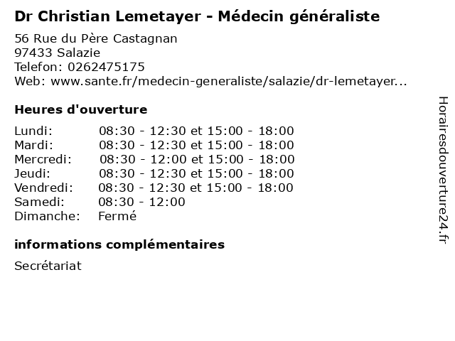 | Lundi | 08:30-12:30 et 15:00-18:00 |