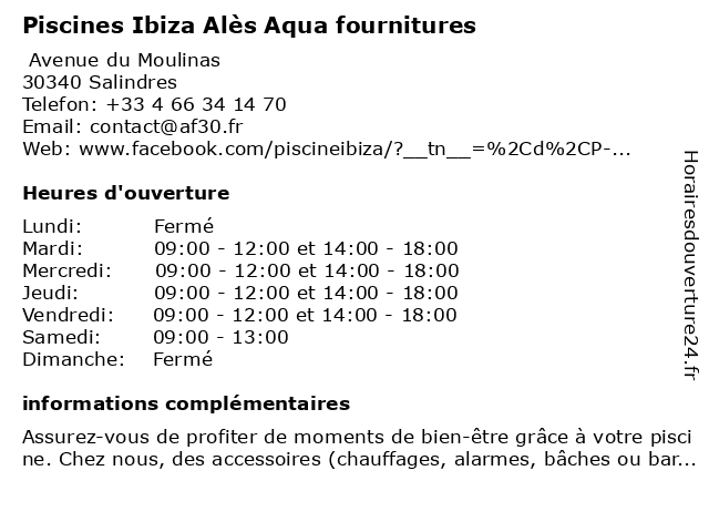 1 Sc Piscines Et Spas (Distance: 3,89 km) 59 Chemin du Mas des Maçons, 30340 Mons et, piscines, sc, spas 2 Gard Piscines Services (Distance: 5,43 km) 50 Chemin du Travers, 30340 Saint-Julien-les-Rosiers gard, piscines, services 3 Piscines Desjoyaux - JAD Piscines (Distance: 5,99 km) 6 Impasse Jean Baptiste Lulli, 30100 Ales de, desjoyaux, fitness, jad, musculation, piscines, salle, sport 5 Communauté de Communes Alès (Distance: 6,21 km) 1642 Chemin de Trespeaux, 30105 Ales administration, alès, communauté, communes, de, services publics 6 Piscines MAGILINE - Aquaterre (Distance: 6,87 km) 641 Chemin de Larnac, 30100 Alès aquaterre, magiline, piscines |