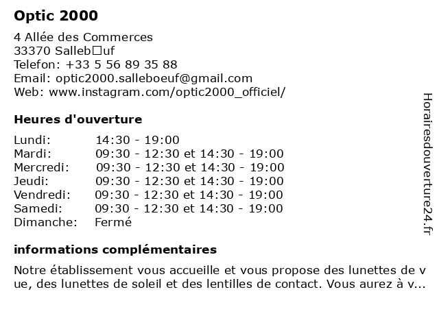 5 Opticien SallebÅ?uf - Optic 2000 (Distance: 0,00 km) 4 Allée des Commerces, 33370 SallebÅ?uf 2000, optic, optic2000 salleboeuf, opticien, opticien salleboefu, opticien salleboeuf, optique 2000 salleboeuf, sallebå?uf 6 Confort Auto / Mecanic 2000 (Distance: 6,33 km) - Artisanale, 16300 St Hilaire 2000, auto, automobile, autovision, confort, contrôle technique, mecanic |