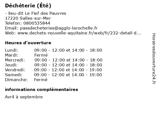 1 Déchèterie (Été) (Distance: 3,47 km) n/c Zone Artisanale Saint Jean des Sables, 17340 Châtelaillon-Plage bennes, collecte, déchets, déchèterie, détritus, poubelles, été 2 Déchèterie (Été) (Distance: 5,48 km) n/c Chemin du Pontreau, 17440 Aytré bennes, collecte, déchets, déchèterie, détritus, poubelles, été 3 Déchèterie (Été) (Distance: 7,34 km) n/c Rue Gustave Ferrié, 17180 Périgny bennes, collecte, déchets, déchèterie, détritus, poubelles, été 4 Déchèterie (Été) (Distance: 8,71 km) n/c Rue Debussy, 17000 La Rochelle bennes, collecte, déchets, déchèterie, détritus, poubelles, été 5 Déchèterie (Été) (Distance: 8,94 km) - Le Fief Jaubertin, 17220 Saint-Médard-d'Aunis bennes, collecte, déchets, déchèterie, détritus, poubelles, été 6 Déchèterie (Été) (Distance: 12,41 km) - Chemin de Dunkerque, 17000 La Rochelle bennes, collecte, déchets, déchèterie, détritus, poubelles, été |