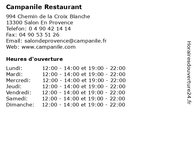 1 Hotel Campanile (Distance: 0,00 km) 994 Chemin de la Croix Blanche, 13300 Salon En Provence bar, campanile, hotel, restaurant 2 Campanile (petit dejeuner ) (Distance: 0,00 km) 994 Chemin de la Croix Blanche, 13300 Salon En Provence bar, campanile, dejeuner, petit, restaurant 3 4 Campanile Restaurant (Distance: 34,19 km) 59 Avenue Anne Marie, 13015 Marseille bar, campanile, restaurant 5 Hôtel Campanile (Distance: 35,77 km) . Route De Marseille, 84140 Avignon bar, campanile, hotel, hôtel, restaurant, service 6 Campanile (Distance: 35,77 km) 1741 route de Marseille, 84140 Montfavet beauté, boutiques, campanile, déco, enfants, mode, mode femme, shopping |