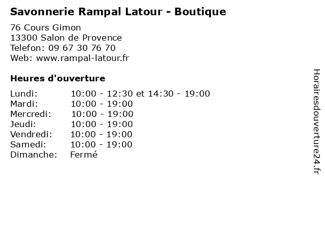 1 Savonnerie Rampal Latour - Boutique (Distance: 9,95 km) - Village de Marques, 13140 Miramas artisanale, boutique, latour, rampal, savonnerie 2 Chambre de Commerce et d'Industrie - Boutique (Distance: 0,19 km) 246 Cours Gimon, 13300 Salon de Provence boutique, chambre, commerce, creation, d'industrie, de, et, reprise, transmission d'entreprises 3 Boutique Orange - Salon de Provence (Distance: 0,32 km) 1 Boulevard de la République, 13300 Salon-de-Provence boutique, de, orange, provence, salon 4 Savonnerie Rampal Latour - Magasin d'usine (Distance: 0,60 km) 201 impasse Monge, 13300 Salon De Provence artisanale, d'usine, latour, magasin, rampal, savonnerie 5 Savonnerie Rampal Latour - Magasin d'Usine (Distance: 0,60 km) 71 rue Félix Payat, 13300 Salon de Provence artisanale, d'usine, latour, magasin, rampal, savonnerie 6 Savonnerie Marius Fabre (Du 1er avril au 30 septembre) (Distance: 0,71 km) 148 avenue Paul Bourret, 13300 Salon-de-Provence 1er, 30, au, avril, du, fabre, magasin, marius, savonnerie, savons, septembre, vente |