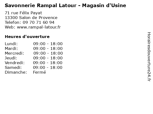 1 Savonnerie Rampal Latour - Magasin d'usine (Distance: 0,00 km) 201 impasse Monge, 13300 Salon De Provence artisanale, d'usine, latour, magasin, rampal, savonnerie 2 Savonnerie Marius Fabre (Du 1er avril au 30 septembre) (Distance: 0,38 km) 148 avenue Paul Bourret, 13300 Salon-de-Provence 1er, 30, au, avril, du, fabre, magasin, marius, savonnerie, savons, septembre, vente 3 Savonnerie Marius Fabre (Du 1er octobre au 31 mars) (Distance: 0,38 km) 148 avenue Paul Bourret, 13300 Salon-de-Provence 1er, 31, au, du, fabre, magasin, marius, mars, octobre, savonnerie, savons, vente 4 Savonnerie Rampal Latour - Boutique (Distance: 0,60 km) 76 Cours Gimon, 13300 Salon de Provence artisanale, boutique, latour, rampal, savonnerie 5 Rampal latour (Distance: 4,64 km) 201 impasse Gaspard Monge, 13300 Salon-de-Provence atelier, latour, magasins, rampal, savons, vente 6 La savonnerie de L'ilot (Distance: 6,56 km) Route de Lambesc, 13330 Pélissanne de, l'ilot, la, savonnerie |