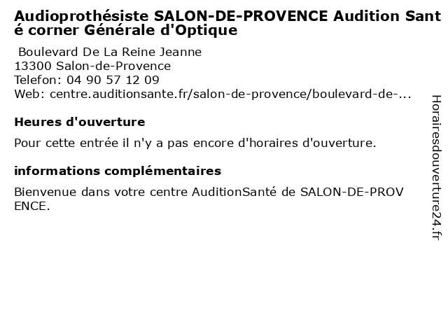 | Appeler Audioprothésiste SALON-DE-PROVENCE Audition Santé corner Générale d'Optique | |