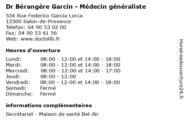 | Mercredi | 08:00-12:00 et 14:00-17:00 |