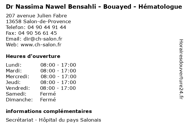 1 Dr Amine Bouayed - Chirurgien viscéral et digestif (Distance: 0,00 km) 207 avenue Julien Fabre, 13658 Salon-de-Provence amine, bouayed, chirurgien, consultation, digestif, docteur, dr, et, med, médecin, médecine, traitement, viscéral 2 Medecin Mohammed El Ami Bouayed (Chirurgien viscéral) (Distance: 0,08 km) 207 Avenue Julien Fabre, 13300 Salon-de-Provence ami, bouayed, chirurgien, docteur, el, medecin, mohammed, sante, services, viscéral 3 Ghazouani Nassima (Distance: 2,92 km) Rue Georges Feydeau, 13300 Salon De Provence ghazouani, nassima, restaurants 4 Dr Diane Coso - Hématologue (Distance: 37,05 km) - Quartier Fourchon, 13637 Arles consultation, coso, diane, docteur, dr, hématologue, med, médecin, médecine, traitement 5 Dr Aude Charbonnier - Hématologue (Distance: 37,05 km) - Quartier Fourchon, 13637 Arles aude, charbonnier, consultation, docteur, dr, hématologue, med, médecin, médecine, traitement 6 Maître Nassima Ferchiche - Avocate (Distance: 43,85 km) 28 boulevard National, 13001 Marseille avocate, avocats, civils, droits, ferchiche, juridiques, maître, nassima |