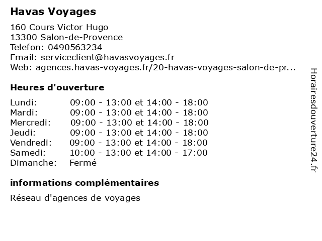 1 Havas Voyages (Distance: 10,44 km) 15 Place Jean Jaures, 13140 Miramas agence, havas, services, voyages 2 Jetset Voyages / Telleschi Voyages (Distance: 0,24 km) 91 Cours Carnot, 13300 Salon De Provence agence, billet d'avion et hôtel pour votre club, jetset, séjour, telleschi, voyages 3 Selectour - Telleschi Voyages (Distance: 0,24 km) 91 Cours Carnot, 13300 Salon-de-Provence billets de train, selectour, séjours, telleschi, vols, voyage, voyages 4 E.Leclerc Voyages (Distance: 4,66 km) . Route De Pelissanne, 13300 Salon-de-Provence e.leclerc, séjours, séjours vacances, voyages 5 Selectour - Eyguières Voyages (Distance: 7,22 km) 10 Za Les Paluds, 13430 Eyguieres billets de train, eyguières, selectour, séjours, vols, voyage, voyages 6 |