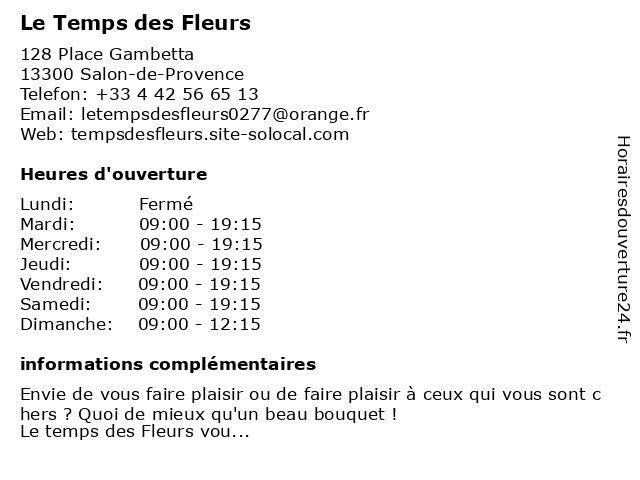 1 Orange Bleu Fleurs (Distance: 0,49 km) 245 place Jules Morgan, 13300 Salon-de-Provence bleu, décorateur, fleuriste, fleurs, orange 2 Aime Ma Fleurs (Distance: 3,35 km) 534 rue Federico Garcia, 13300 Salon-de-Provence aime, bouquet, composition, fleuriste, fleurs, lys, ma, roses 3 Boutic Fleurs (Distance: 4,17 km) 22 Rue Carnot, 13330 Pélissanne bouquet, boutic, composition, fleuriste, fleurs 4 Fleurs d'Eugénie (Distance: 4,50 km) 22 cours Camille Pelletan, 13450 Grans cadeaux, composition, d'eugénie, décoration, fleuriste, fleurs, plantes 5 Le Temps des Cerises (Distance: 9,82 km) - Mas de la Péronne, 13140 Miramas accessoires, cerises, des, habillement, le, mode, pret à porter, temps, vêtements 6 Les Pat Temps (Distance: 10,16 km) 5 Bd John Fitzgerald Kennedy, 13140 Miramas pat, restaurants, saurellino, temps |