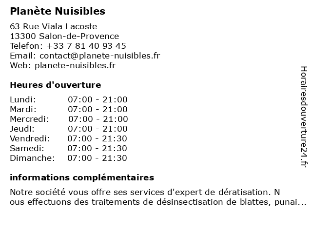 2 HTE Sanitation (Distance: 17,54 km) 2 Rue André-Marie Ampère, 13880 Velaux dératisation, entretien, hte, nuisibles, sanitation, services 3 Assistance Anti Nuisibles (Distance: 25,10 km) 215 chemin du Guigonnet, 13270 Fos-sur-Mer anti, assainissement, assistance, bois, dératisation, désinsectisation, nuisibles, traitement 4 AFPAH (Distance: 30,28 km) 2 Avenue De L’Europe, 13090 Aix-en-Provence afpah, dératisation, extermination, nuisibles, services 5 Stop Nuisibles 84 (Distance: 31,66 km) Chemin du Lagnien, 84800 L'Isle-sur-la-Sorgue 84, nuisibles, stop 6 AFPAH (Distance: 39,31 km) 11 Avenue de l’Orme Fourchu, 84000 Avignon afpah, dératisation, extermination, nuisibles, services |