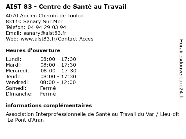 1 AIST 83 - Centre de Santé au Travail (Distance: 6,82 km) 57 Allée de Vilnius, 83500 La Seyne-sur-Mer 83, aist, aist83, au, bilans, centre, de, santé, travail 2 AIST 83 - Centre de Santé au Travail (Distance: 8,22 km) - Impasse des Peupliers, 83190 Ollioules 83, aist, aist83, au, bilans, centre, de, santé, travail 3 AIST 83 - Centre de Santé au Travail (Distance: 11,72 km) 33 Rue Berrier Fontaine, 83000 Toulon 83, aist, aist83, au, bilans, centre, de, santé, travail 4 AIST 83 - Centre de santé au travail (Distance: 13,11 km) 174 Rue Danton, 83000 Toulon 83, aist, aist83, au, bilans, centre, de, santé, travail 5 AIST 83 - Centre de Santé au Travail (Distance: 17,98 km) - ZI Signes, 83870 Signes 83, aist, aist83, au, bilans, centre, de, santé, travail 6 Artisan Richard Couvreur 83 (Distance: 0,93 km) 83 Avenue du Pont d'Aran, 83110 Sanary-sur-Mer 83, artisan, bardage, construction, couverture, couvreur, isolation, richard, rénovation, toiture, zinguerie, étanchéité |