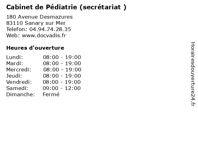 1 Cabinet de Pédiatrie (secrétariat ) (Distance: 7,01 km) 36 Quai Hoche, 83500 La seyne sur mer cabinet, consultation, de, docteur, médecins, pédiatrie, santé, secrétariat 2 Cabinet Infirmier DUTTO (Distance: 0,18 km) 30 Avenue Gallieni, 83110 Sanary-sur-Mer cabinet, dutto, infirmier 3 Cabinet médical - Les Arcades - Médecine générale (secrétariat ) (Distance: 0,26 km) 14 quai Marie Esmenard, 83110 Sanary sur Mer arcades, cabinet, consultation, docteur, générale, les, médecine, médical, santé, secrétariat 4 Cabinet médical de groupe - Médecine générale (secrétariat ) (Distance: 0,28 km) 152 Avenue Général Rose, 83110 Sanary sur Mer cabinet, consultation, de, docteur, groupe, générale, médecine, médical, santé, secrétariat 5 Cabinet Virginie Guyot (Distance: 0,35 km) 10 Rue Joseph Courrau, 83110 Sanary-sur-Mer cabinet, guyot, virginie 6 Cabinet Delta Immobilier (Distance: 0,50 km) 225 avenue du 2eme Spahis, 83110 Sanary-Sur-Mer agence, cabinet, delta, gestion, immobilier, location, transaction, vente |