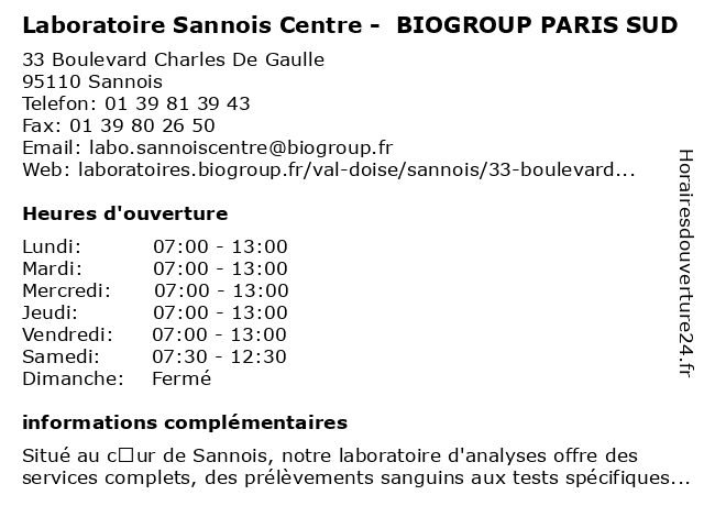 1 Biosmose - Laboratoire Bounetta (Distance: 0,11 km) 23 boulevard Charles de Gaulle, 95110 Sannois analyses, biosmose, bounetta, labaoratoire, laboratoire, prelevement, sang 2 Auditio Laboratoire (Distance: 0,24 km) 6 Boulevard Charles de Gaulle, 95110 Sannois auditio, laboratoire 4 Bio Inov - Laboratoire d'analyses médicales (Distance: 2,07 km) 15 Avenue Danielle Casanova, 95210 Saint Gratien analyses, bio, d'analyses, inov, laboratoire, medicales, médicales, services 5 Laboratoire Ermont Centre - BIOGROUP PARIS SUD (Distance: 2,09 km) 2 Rue Du 18 Juin, 95120 Ermont biogroup, centre, dépistages, ermont, laboratoire, laboratoire de diagnostic, paris, sud 6 Bio Paris Quest (Distance: 3,33 km) 161 Rue Paul Vaillant Couturier, 95100 Argenteuil bio, biologique, laborataire, paris, quest, santé, services |