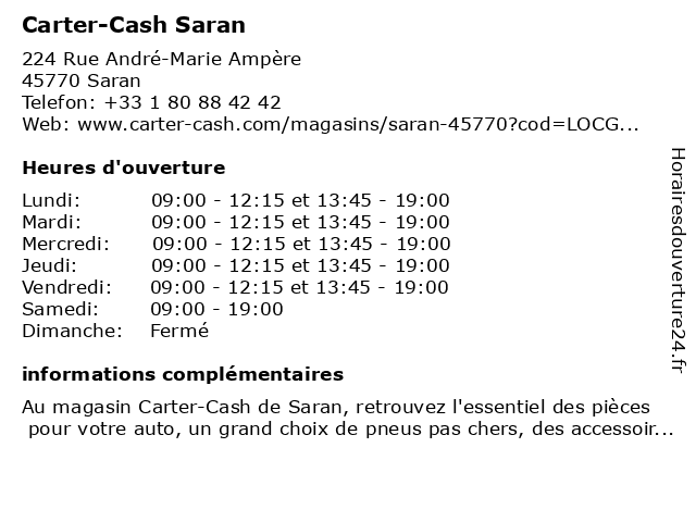 Au magasin Carter-Cash de Saran, retrouvez l'essentiel des pièces pour votre auto, un grand choix de pneus pas chers, des accessoires et des services d'entretien sans rendez-vous en atelier... Le ...