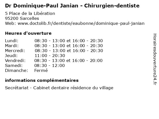1 Dr Dominique-Paul Janian - Chirurgien-dentiste (Distance: 7,79 km) 14 Rue de Saint-Prix, 95602 Eaubonne chirurgien, consultation, dentiste, docteur, dominique, dr, janian, med, médecin, médecine, paul, traitement 2 Dr. Dominique Hottois - Médecine générale (Consultation sur rendez-vous) (Distance: 0,01 km) 5 Place de La Libération, 95200 Sarcelles consultation, docteur, dominique, dr., générale, hottois, médecine, rendez, santé, sur, vous 3 Dr. Dominique Hottois - Médecine générale (Consultation libre) (Distance: 0,01 km) 5 Place de La Libération, 95200 Sarcelles consultation, docteur, dominique, dr., générale, hottois, libre, médecine, santé 4 Dr Paul Emile Labeyrie - Radiologue (Distance: 1,82 km) 3 Boulevard Maréchal de Lattre de Tassigny, 95200 Sarcelles angioplastie, artériographie, dr, embolisation, emile, fibromes, hôpital, labeyrie, nord, parisien, paul, privé, radiologue, utérins, vertébroplastie 5 Dr Dominique Drouin - Gynécologue médical et obstétrique (Distance: 4,65 km) 35 Rue d'Amiens, 93240 Stains dominique, dr, drouin, et, gynécologie, gynécologue, médical, obstétrique 6 Dr Dominique Mariette - Chirurgien viscéral et digestif (Distance: 6,74 km) 2 rue du Docteur Delafontaine, 93205 Saint-Denis chirurgien, consultation, digestif, docteur, dominique, dr, et, mariette, med, médecin, médecine, traitement, viscéral |