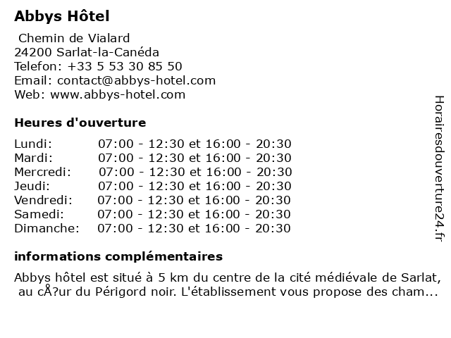 1 Hôtel-Restaurant La Hoirie (Distance: 2,01 km) . Rue Jacques Anquetil, 24200 Sarlat-la-Caneda bar, hoirie, hotel, hôtel, la, logis, restaurant, réunions, évenements 2 Hôtel-Restaurant Le Relais du Touron (Distance: 2,69 km) 3881 route de Gourdon, 24200 Carsac-Aillac bar, bistrot, brasserie, café, du, hotel, hôtel, le, relais, restaurant, restauration, touron 3 Hôtel Le Mas del Pechs (Distance: 2,98 km) 10 Route des Pechs, 24200 Sarlat-la-Canéda bar, del, hotel, hôtel, le, mas, pechs, restaurant, service 4 Logis Hôtel Delpeyrat (Distance: 3,17 km) - Le Village, 24200 Carsac-Aillac bar, delpeyrat, hotel, hôtel, logis, restaurant, réunions, évenements 5 Hôtel Best Western - Réception (Distance: 3,72 km) 2 Rue Abbe Surguier, 24200 Sarlat-La-Caneda best, hebergement, hotel, hôtel, réception, western 6 Hôtel Saint Albert (Distance: 3,79 km) 22-24 Avenue du Général Leclerc, 24200 Sarlat-la-Canéda albert, bar, hotel, hôtel, restaurant, saint, service |