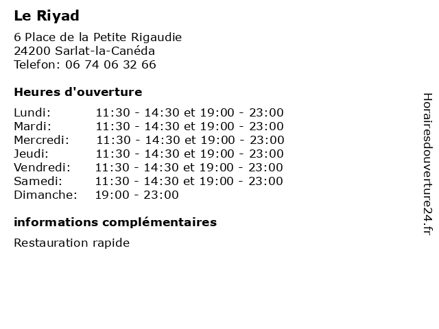| Samedi | 11:30-14:30 et 19:00-23:00 |