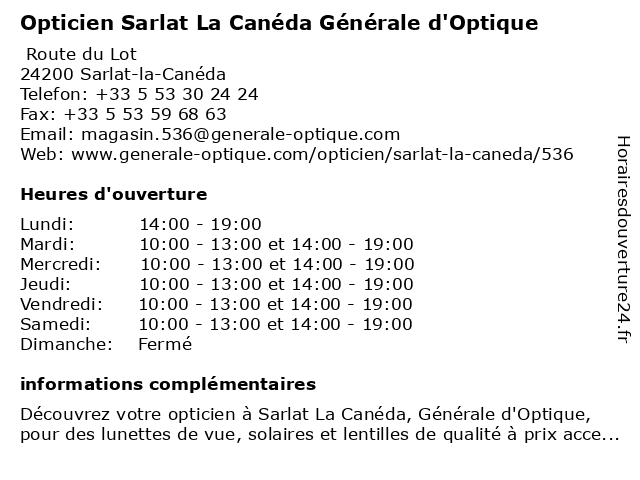 1 Opticien Sarlat-la-Canéda - Optic 2000 - Avenue de Madrazes (Distance: 0,21 km) Avenue de Madrazes, 24200 Sarlat-la-Canéda 2000, avenue, canéda, de, la, lentilles de contact, lunettes de soleil, lunettes de vue, madrazes, optic, optic2000, opticien, opticien optic2000, ray-ban, rayban, sarlat 2 Opticien Sarlat | Alain Afflelou (Distance: 1,22 km) 17 Avenue Thiers, 24200 Sarlat afflelou, alain, magasin de lunettes de soleil, magasin d’accessoires de mode, opticien, optométrie, sarlat 3 Lissac l'Opticien Sarlat-la-Canéda - Lunettes de vue, de soleil, lentilles (Distance: 1,50 km) 55 Rue de la République, 24200 Sarlat-la-Canéda canéda, de, l'opticien, la, lentilles, lentilles de contact, lissac, lunettes, lunettes de soleil, lunettes de vue, opticien, opticien lissac, sarlat, soleil, vue 4 Cabinet médical - Médecine générale (secrétariat ) (Distance: 3,10 km) 20 allee de la Garrissade, 24200 Sarlat- la-Caneda cabinet, consultation, docteur, générale, médecine, médical, santé, secrétariat 5 Dr. Gilles PHILIPPON - Médecine générale (Consultation sur rendez-vous) (Distance: 14,02 km) 18 Rue du Pigeonnier, 24220 Saint-Cyprien consultation, docteur, dr., gilles, générale, medecins, médecine, philippon, rendez, santé, sur, vous 6 Dr. Gilles PHILIPPON - Médecine générale (Consultation libre) (Distance: 14,02 km) 18 Rue du Pigeonnier, 24220 Saint-Cyprien consultation, docteur, dr., gilles, générale, libre, medecins, médecine, philippon, santé |