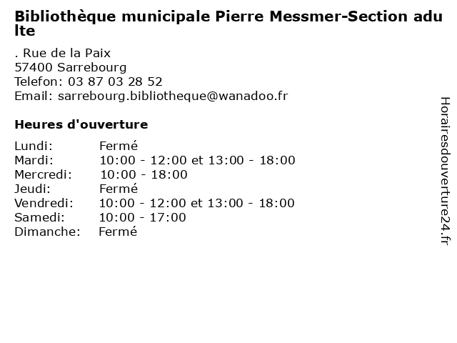 1 Bibliothèque municipale Pierre Messmer-periode scolaire (Distance: 0,00 km) . Rue de la Paix, 57400 Sarrebourg bibliothèque, cd audio, cd.rom, livres, messmer, municipale, periode, pierre, revues, scolaire 2 Bibliothèque municipale Pierre Messmer-vacances zone B (Distance: 0,00 km) . Rue de la Paix, 57400 Sarrebourg bibliothèque, cd audio, cd.rom, livres, messmer, municipale, pierre, revues, vacances, zone 3 Bibliothèque Municipale (Distance: 3,52 km) . Rue du 21 Novembre, 57445 Reding bibliothèque, cd audio, cd.rom, livres, municipale, revues 4 Bibliothèque Municipale (Distance: 10,95 km) 4. rue Antoine Huber, 57815 Gondrexange bibliothèque, biliothèque, cd audio, cd.rom, livres, municipale, revues 5 Bibliothèque Municipale (Distance: 11,37 km) 84 rue Jordy, 57560 Abreschviller bibliothèque, cd audio, cd.rom, livres, municipale, revues 6 Bibliothèque (Distance: 11,41 km) 1 rue de l'église, 57820 Henridorff bibliothèque, cd audio, cd.rom, livres, revues |
