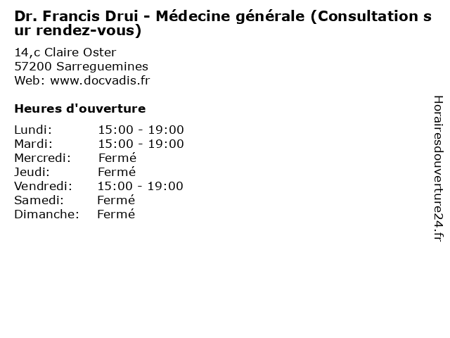 1 Dr. Francis Drui - Médecine générale (Consultation libre) (Distance: 0,00 km) 14,c Claire Oster, 57200 Sarreguemines consultation, docteur, dr., drui, francis, générale, libre, médecine, santé 2 Dr. Marlyse Bernard - Médecine générale (Consultation sur rendez-vous) (Distance: 14,66 km) 8 Avenue Victor Hugo, 57450 Farébersviller bernard, consultation, docteur, dr., générale, marlyse, medecins, médecine, rendez, santé, sur, vous 3 Dr. Marlyse Bernard - Médecine générale (Consultation libre) (Distance: 14,66 km) 8 Avenue Victor Hugo, 57450 Farébersviller bernard, consultation, docteur, dr., générale, libre, marlyse, medecins, médecine, santé 4 Dr. Marlyse Bernard - Médecine générale (Consultation libre enfants) (Distance: 14,66 km) 8 Avenue Victor Hugo, 57450 Farébersviller bernard, consultation, docteur, dr., enfants, générale, libre, marlyse, medecins, médecine, santé 5 Medecin Pascal Meyer - Consultation à domicile (Médecin généraliste) (Distance: 15,44 km) 14 Michel Debre, 57600 Forbach consultation, docteur, domicile, généraliste, medecin, meyer, médecin, pascal, sante, services 6 Dr. Guillaume BIZJAK - Médecine générale (Consultation libre) (Distance: 16,20 km) 1 rue des Carriers, 57800 Cocheren bizjak, consultation, docteur, dr., guillaume, générale, libre, medecins, médecine, santé |