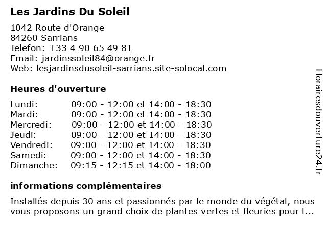 1 Laverie Du Soleil (Distance: 2,41 km) 56 boulevard Marius Bastidon, 84260 Sarrians blanchisserie, du, laverie, linge, location, repassage, soleil 2 Restaurant Soleil d'Asie (Distance: 9,17 km) . ZAC du Coudoulet, 84100 Orange 'asie, asie, d'asie, grill, restaurant, riz, soleil, vapeur, wok 3 Les Jardins De Provence (Distance: 9,34 km) Route de la Roque, 84210 Althen-des-Paluds de, jardins, les, provence 4 Lissac l'Opticien Orange (Espace Volter) - Lunettes de vue, de soleil, lentilles (Distance: 9,79 km) 139 Rue du Colonel Armaud Beltrame, 84100 Orange de, espace, l'opticien, lentilles, lentilles de contact, lissac, lunettes, lunettes de soleil, lunettes de vue, opticien, opticien lissac, orange, soleil, volter, vue 5 La Bouquetterie du Soleil (Distance: 11,90 km) 1170 chemin d'Embanay, 84200 Carpentras bouquet, bouquetterie, composition, du, fleuriste, fleurs, la, plantes, soleil 6 |