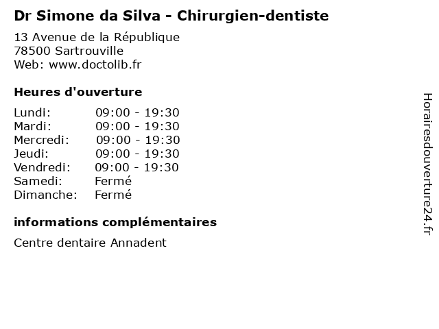1 Dr Simone Da Silva - Chirurgien-dentiste (Distance: 11,62 km) 63 Boulevard Jean Jaurès, 92110 Clichy chirurgien, da, dentiste, dr, médecin, médecine, médical, pharmaceutique, silva, simone, traitement 4 Dr Elodie da Rocha - Chirurgien dentiste (Distance: 1,69 km) 23 bis rue de la Muette, 78600 Maisons-Laffitte chirurgien, da, dentaire, dentiste, dr, elodie, implantologie, parodontologie, rocha 5 Silvia Da Silva Pinto - Sophrologue (Distance: 3,50 km) 51 Rue Gustave Caillebotte, 78420 Carrières-sur-Seine da, medecin, pinto, sante, silva, silvia, sophro, sophrologue 6 Ferreira Da Silva Neves Mota Maria l (Distance: 3,79 km) 61 Route De Pontoise, 95100 Argenteuil da, ferreira, maria, mota, neves, restaurants, silva |