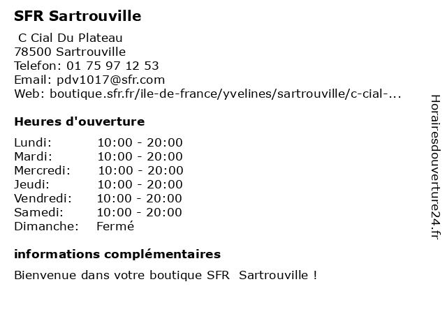 1 SFR (Distance: 0,31 km) - Avenue Robert Schuman, 78500 Sartrouville abonnements de téléphonie mobile ou fixe fixe ou carte prépayée, accès internet haut débit ou la fibre optique ainsi que des abonnements à des bouquets de chaînes de télévision ., sfr, téléphones mobiles 2 SFR (Distance: 3,71 km) 23 bis Avenue de longueil, 78600 Maisons Laffitte fournisseur de services internet, sfr 3 SFR (Distance: 4,07 km) 50 Avenue du Maréchal Foch, 95100 Argenteuil beaute, cafe, chaussures, enfants, lingerie, mode femmes, mode hommes, restaurant, sfr, sport 4 SFR (Distance: 4,09 km) - Carême Prenant, 95100 Argenteuil abonnements de téléphonie mobile ou fixe fixe ou carte prépayée, accès internet haut débit ou la fibre optique ainsi que des abonnements à des bouquets de chaînes de télévision ., sfr, téléphones mobiles 5 Boutique SFR (Distance: 4,30 km) 280 Avenue Gabriel Péri, 78360 Montesson abonnements, boutique, fibre, mobile télévision, sfr, téléphones, téléphonie 6 Boutique SFR (Distance: 5,60 km) 167 Boulevard Victor Bordier, 95370 Montigny lès Cormeilles boutique, boutiques, mobiles, services, sfr, telephones |