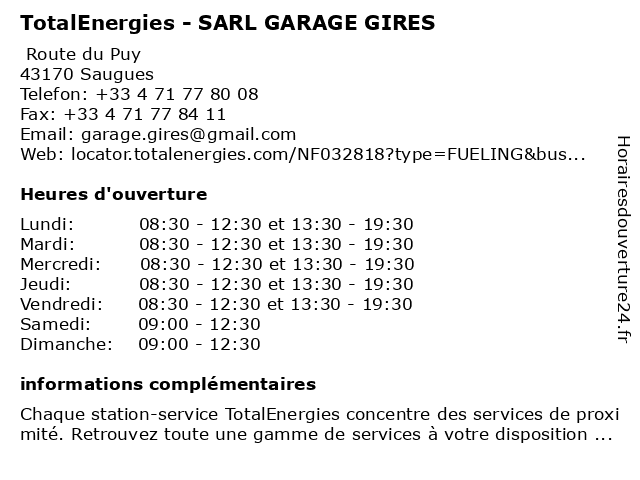 1 Garage Gires - Renault (Distance: 0,25 km) - Route du Puy, 43170 Saugues automobile, concessionnaire, entretien, garage, gires, renault, réparation, vente 2 TotalEnergies - SAS ETS GIRAUD (Distance: 21,36 km) La Buge, 43230 Saint-Georges-d'Aurac ets, gas station, giraud, sas, station service, tankstelle, total, totalenergies 3 TotalEnergies (Distance: 22,72 km) N102, 43320 Vazeilles-Limandre gas station, station service, tankstelle, total, totalenergies 4 Access - TotalEnergies (Distance: 27,92 km) 32 Rue Chaussade, 43000 Le Puy-en-Velay access, point, totalenergies, ups 5 TotalEnergies - SARL HERMET (Distance: 27,99 km) 6 AVENUE PIERRE PIGNIDE, 48200 ST CHELY D APCHER gas station, hermet, sarl, station service, tankstelle, total, totalenergies 6 Station-Service TotalEnergies (Distance: 37,90 km) n/a Quartier de la Gare, 43800 Vorey carburant, essence, pompes, service, station, totalenergies, véhicules |