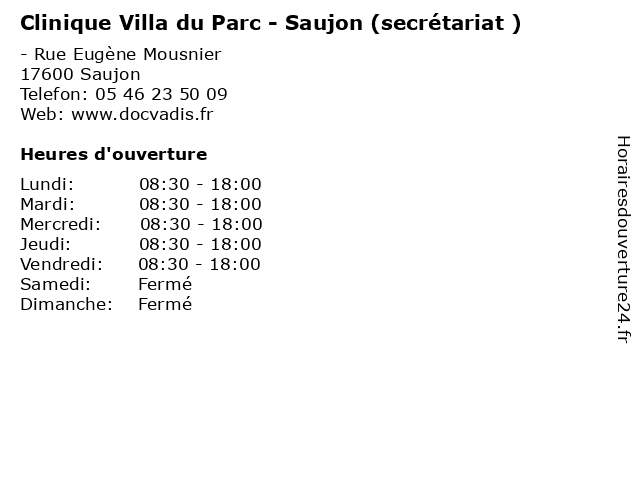 Termes de recherche pour Clinique Villa du Parc - Saujon (secrétariat ):du, saujon, clinique, villa, santé, parc, secretariat, docteur, médecins, consultation |