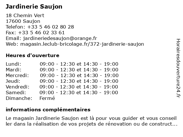1 Les Briconautes - La Jardinerie (Distance: 5,31 km) 260 cours Emile Zola, 17600 Saujon briconautes, et, jardin, jardinerie, la, les, maison, matériel, outils, passion, électricité 3 Patour Horticulture (Distance: 19,09 km) 81 route de Thénac, 17460 Retaud horticulture, jardinerie, patour, plantes, pépinière, végétaux 4 GAMM VERT (Distance: 21,28 km) Avenue de Villeneuve, 17620 Saint-Agnant animalerie, gamm, jardin, jardinerie, mobilier de jardin, plantes, pépinière, vert 5 Begofyn (Distance: 28,22 km) 13 Rue Charles Plumier, 17300 Rochefort-Sur-Mer begofyn, jardinerie, plantes, pépinière, végétaux 6 Gamm vert (Distance: 32,47 km) 34 AV DU GENERAL LECLERC, 28100 CHARTRES animalerie, animaux, gamm, horticulteur, jardin, jardinerie, vert |