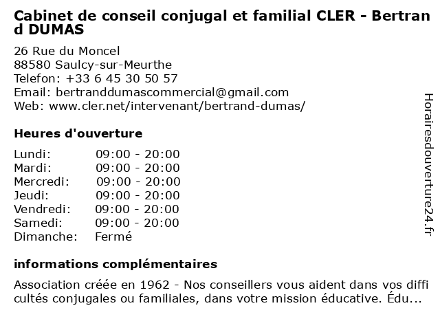 Termes de recherche pour Cabinet de conseil conjugal et familial CLER - Bertrand DUMAS:et, de, cabinet, conseil, bertrand, dumas, familial, cler, conjugal |
