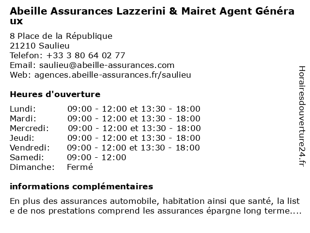 1 Allianz Vié Edouard Agent Général (Distance: 0,07 km) 4 Rue des Fours, 21210 Saulieu agent, allianz, edouard, général, vié 2 MMA Assurances SAULIEU (Distance: 0,18 km) 10 Rue de la Foire, 21210 Saulieu assurance au tiers, assurance auto, assurance auto au tiers, assurance auto pas cher, assurance auto tous risques, assurance habitation, assurance habitation pas cher, assurance local, assurance multirisque, assurance professionnelle, assurance santé, assurance tous risques, assurance voiture, assurances, flotte, garantie décennale, mma, mutuelle, mutuelle sénior, rc pro, responsabilité civile, saulieu 3 Areas Assurances (Distance: 0,21 km) 29 Rue de la Foire, 21210 Saulieu areas, assurances, santé, services 4 Abeille Assurances (Distance: 24,69 km) 20 Rue du Général de Gaulle, 21320 Pouilly En Auxois abeille, assurance, assurance abeille, assurance auto, assurance-vie, assurances, habitation, santé 5 Abeille Assurances (Distance: 24,85 km) 24 Rue de la Liberté, 21140 Semur-en-Auxois abeille, assurance, assurance abeille, assurance auto, assurance-vie, assurances, habitation, santé 6 Abeille Assurances (Distance: 37,23 km) 4 Grande Rue Chauchien, 71400 Autun abeille, abeille assurances, assurance, assurance auto, assurance vie, assurances, habitation, santé |