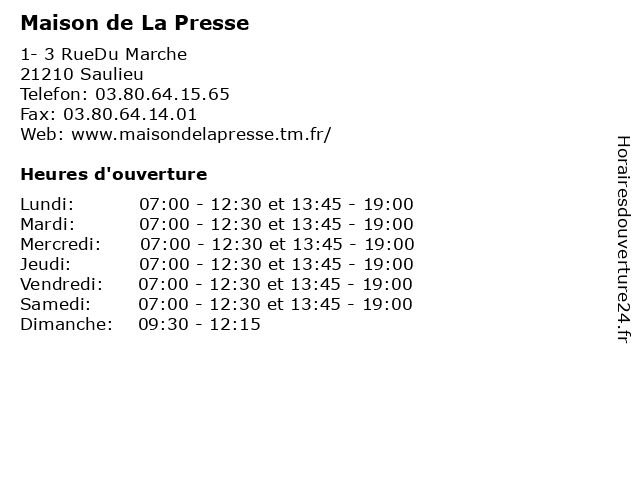 | Samedi | 07:00-12:30 et 13:45-19:00 |