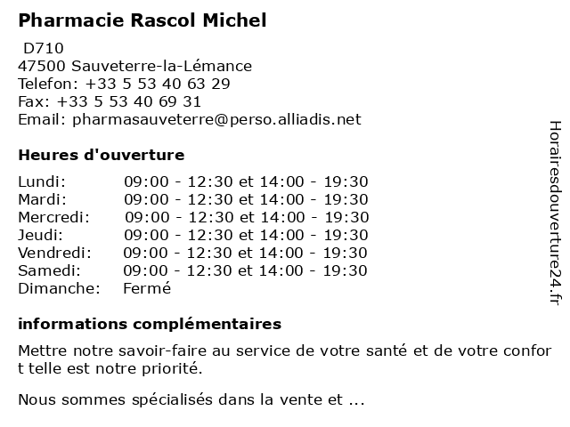 | Samedi | 09:00-12:30 et 14:00-19:30 |