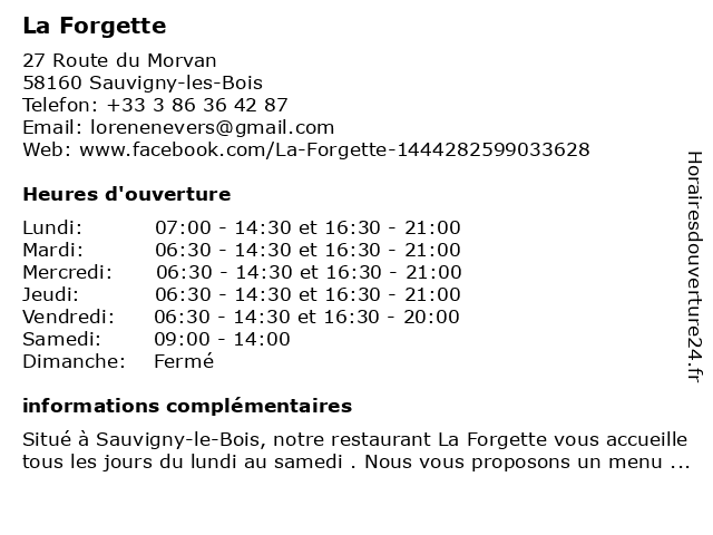 Situé à Sauvigny-le-Bois, notre restaurant La Forgette vous accueille tous les jours du lundi au samedi . Nous vous proposons un menu du jour composé d'une entrée, d'un plat, de fromage et/ou d...