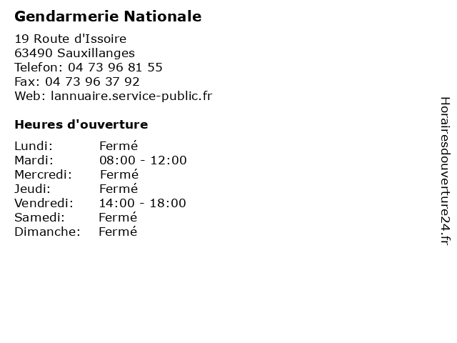 1 Gendarmerie Nationale (Distance: 9,05 km) 1 Rue du Cerf-Volant, 63500 Issoire brigade, commandant, communauté, gendarme, gendarmerie, nationale, proximité, sécurité 2 Gendarmerie Nationale (Distance: 13,50 km) 90 Rue Lucien Jarrige, 63270 Vic-le-Comte brigade, commandant, communauté, gendarme, gendarmerie, nationale, proximité, sécurité 3 Gendarmerie Nationale (Distance: 14,05 km) - Rue des Jardins, 63340 Saint-Germain-Lembron brigade, commandant, communauté, gendarme, gendarmerie, nationale, proximité, sécurité 4 Gendarmerie Nationale (Distance: 14,53 km) - Le bourg, 63520 Saint-Dier-d'Auvergne brigade, commandant, communauté, gendarme, gendarmerie, nationale, proximité, sécurité 5 Gendarmerie Nationale (Distance: 15,69 km) 4 Rue de la Fontaine des Chiens, 63570 Brassac-les-Mines brigade, commandant, communauté, gendarme, gendarmerie, nationale, proximité, sécurité 6 Gendarmerie Nationale (Distance: 17,02 km) 2 Rue du Président, 43250 Sainte-Florine brigade, commandant, communauté, gendarme, gendarmerie, nationale, proximité, sécurité |