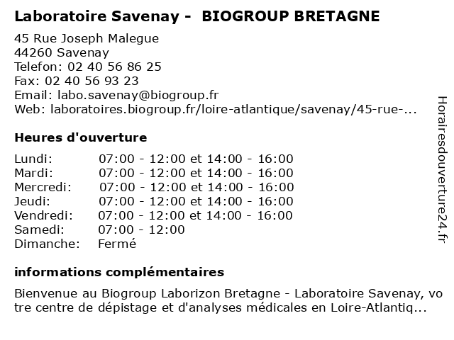 1 LABORIZON BIOLAM - Laboratoire Savenay (Distance: 0,02 km) 45 Rue Joseph Malegue, 44260 Savenay analyse de sang, biolam, coronavirus, covid19, laboratoire, laboratoire d analyse médicale, laborizon, prise de sang, résultats, savenay, sérologie, test covid, test pcr 2 Biolam - Laboratoire Savenay (Distance: 0,52 km) 45 Rue Joseph Malègue, 44260 Savenay biolam, bureau, consultation, dr, laboratoire, maladie, med, médecin, médecine, pratique, savenay, thérapie, traitement 3 BRETAGNE MONTAGES (Distance: 12,34 km) 24 My, 44160 Sainte-Anne-sur-Brivet bretagne, installation et pose de cuisine, montages, plomberie et électricité, pose d'enseignes pour professionnels, rénovation intérieure et extérieure 4 Laboratoire Pontchâteau - BIOGROUP BRETAGNE (Distance: 14,12 km) 21 Route De Vannes, 44160 Pontchâteau biogroup, bretagne, dépistages, laboratoire, laboratoire de diagnostic, pontchâteau 5 LABORIZON BIOLAM - Laboratoire Pontchateau (Distance: 14,12 km) 21 Route de Vannes, 44160 Pontchâteau analyse de sang, biolam, coronavirus, covid19, laboratoire, laboratoire d analyse médicale, laborizon, pontchateau, prise de sang, résultats, sérologie, test covid, test pcr 6 Bretagne Conduite (Distance: 15,03 km) 8 Route de Savenay, 44360 Saint-Étienne-de-Montluc bretagne, conduite |