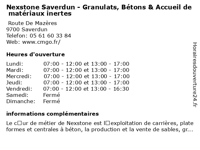 | Vendredi | 07:00-12:00 et 13:00-16:30 |