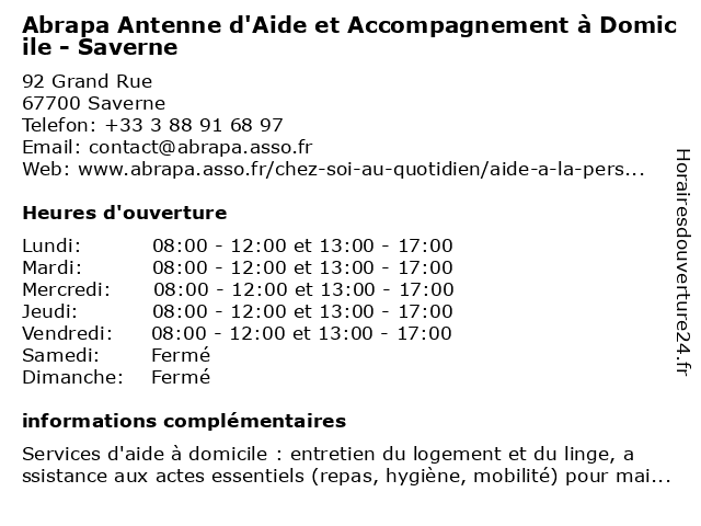 Termes de recherche pour Abrapa Antenne d'Aide et Accompagnement à Domicile - Saverne:et, domicile, antenne, aide à domicile, saverne, accompagnement, d'aide, aide à la mobilité, aide aux repas, entretien du logement, aide à la toilette, abrapa, entretien du linge |