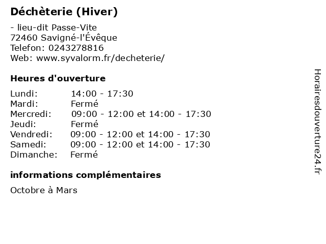 1 Déchèterie (Hiver) (Distance: 7,47 km) n/c la Touche, 72190 Neuville-sur-Sarthe bennes, débarras, déchèterie, détritus, hiver, ordures 2 Déchèterie (Hiver) (Distance: 10,29 km) - lieu-dit Le Paturail, 72450 Lombron bennes, débarras, déchèterie, détritus, hiver, ordures 3 Déchèterie (Hiver) (Distance: 10,55 km) - Zone d'Activités, 72380 Montbizot déchèterie, gravats, hiver, huiles usées, la réception des déchets et écocentres, les appareils électroménagers, les déchets verts, papier et carton en quantité 4 Déchèterie (Hiver) (Distance: 16,97 km) - Les Orées, 72160 Thorigné-sur-Dué bennes, collecte, débarras, déchets, déchèterie, détritus, hiver, tri 5 Déchèterie (Hiver) (Distance: 17,81 km) - ZA du Champ de la Croix, 72160 Tuffé bennes, débarras, déchets, déchèterie, hiver, ordures 6 Déchèterie (Distance: 9,18 km) - Ouserie, 72470 Saint-Mars-la-Brière déchèterie, gravats, huiles usées, la réception des déchets et écocentres, les appareils électroménagers, les déchets verts, papier et carton en quantité |