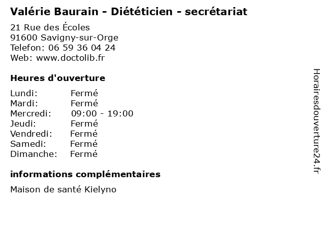 1 Valérie Baurain - Diététicien - secrétariat (Distance: 1,85 km) 9 Place du Maréchal Leclerc, 91260 Juvisy-sur-Orge baurain, cabinet, diététicien, diététique, medical, secrétariat, valérie 2 Maître Valérie Haddad - Avocate (Distance: 1,53 km) 19 rue du Mail, 91600 Savigny-sur-Orge avocate, avocats, civils, droits, haddad, juridiques, maître, valérie 3 Dr Valérie Foussier - Endocrinologue - secrétariat (Distance: 8,29 km) 41 Avenue Aristide Briand, 92160 Antony consultation, docteur, dr, endocrinologue, foussier, med, médecin, médecine, secrétariat, traitement, valérie 4 Dr Valérie Laurent - Gastro-entérologue et hépatologue - secrétariat (Distance: 8,29 km) 41 Avenue Aristide Briand, 92160 Antony consultation, docteur, dr, entérologue, et, gastro, hépatologue, laurent, med, médecin, médecine, secrétariat, traitement, valérie 5 Société Valérie Prim (Distance: 8,47 km) 85 Rue de Châteaurenard, 94550 Chevilly-Larue prim, société, valérie 6 Loïc Gouadon - Diététicien (Distance: 10,28 km) 10 Avenue du Québec, 91140 Villebon-sur-Yvette aliment, dieticien, diététicien, gouadon, loïc, medecin, nutrition |