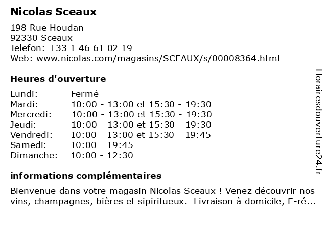 1 Dr Nicolas Saal - Chirurgien-dentiste (Distance: 0,47 km) 54 Avenue de Robinson, 92350 Le Plessis-Robinson chirurgien, dent, dentiste, docteur, dr, nicolas, saal, soins 2 Nicolas Sceaux houdan marche (Distance: 1,06 km) 13 Rue Houdan, 92330 Sceaux champagnes, cidre, houdan, marche, nicolas, rhums, rosé, ruinart, sceaux, spiritueux, vins, vins blancs, vins rouges, whiskies 3 Nicolas (Distance: 1,37 km) 106 Rue Jean Longuet, 92290 Chatenay Malabry champagnes, hyper-supermarchés, nectars, nicolas, vente au détail de vin, vin 4 Nicolas (Distance: 1,43 km) 91 Rue Boucicaut, 92260 Fontenay Aux Roses champagnes, hyper-supermarchés, nectars, nicolas, vente au détail de vin, vin 5 Dr Nicolas Carpentier - Radiologue (Distance: 1,90 km) 5 Rue des Carnets, 92140 Clamart carpentier, consultation, docteur, dr, med, médecin, nicolas, radiologue, traitement 6 Nicolas Bourg la Reine (Distance: 2,52 km) 84 Avenue du Général Leclerc, 92340 Bourg-la-Reine bourg, champagnes, cidre, la, nicolas, reine, rhums, rosé, ruinart, spiritueux, vins, vins blancs, vins rouges, whiskies |