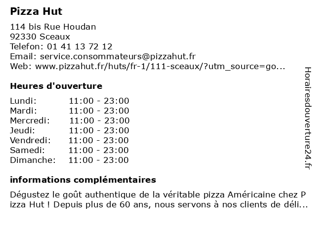 4 Pizza Hut (Distance: 4,75 km) 39 Avenue Du Général De Gaulle, 92360 Meudon-la-foret hut, pizza, restaurants 5 Pizza Hut (Distance: 6,12 km) - Voie de Briis, 91300 Massy alimentaires, boissons, hut, pizza, restaurant 6 |
